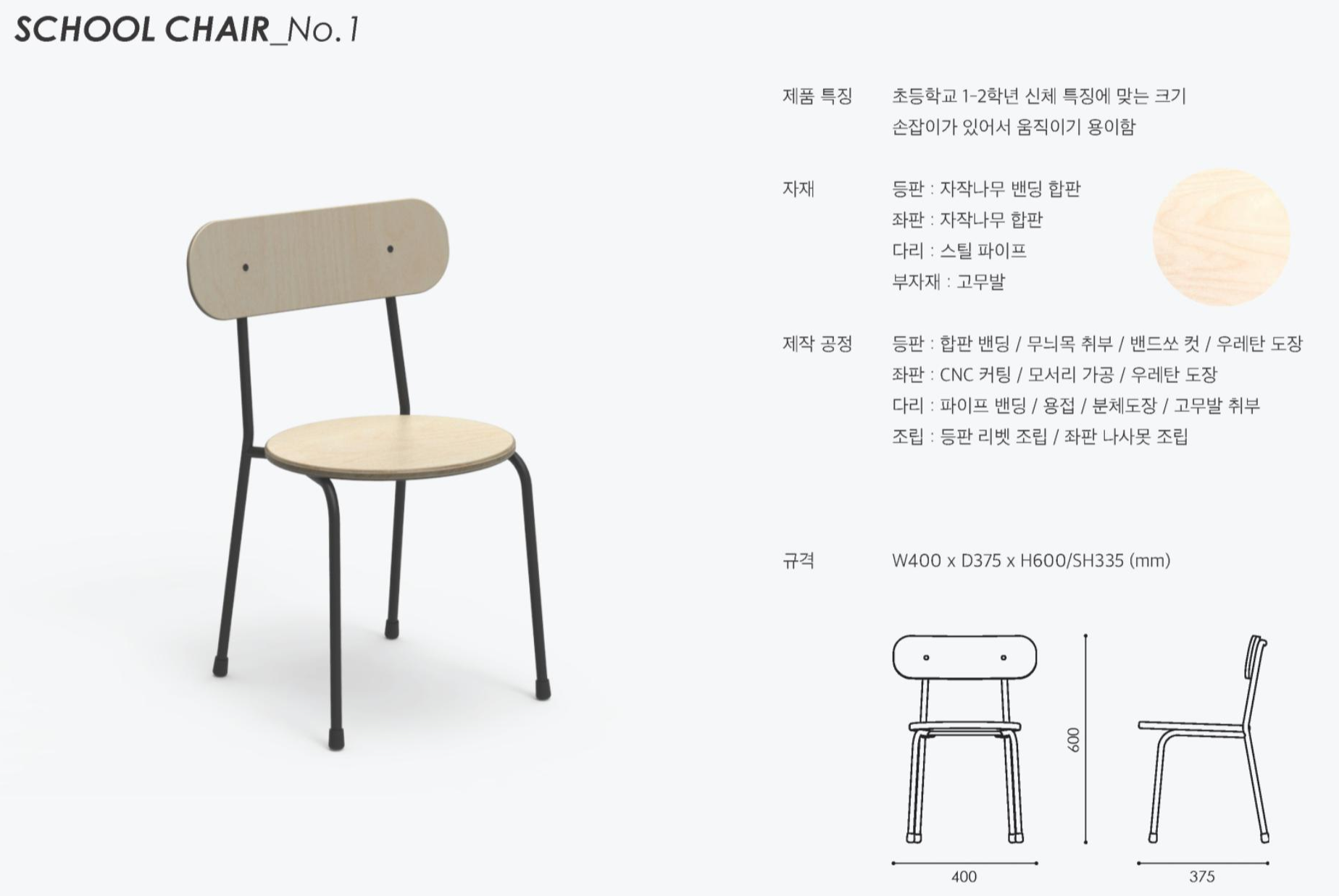 1~2학년 신체 사이즈에 맞게 제작 되었습니다. 등받이가 넓어 편안하고, 가벼워서 이동 수업에 편리합니다.